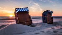 Ligstoelen gefotografeerd op het strand van Egmond aan Zee tijdens de zonsondergang (gouden uur).