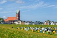 Strandstoelen op het groene strand en de Garnizerkerk in Cuxhaven-Grimmershörn, Noordzeebadplaats Cuxhaven, Nedersaksen, Duitsland, Europa