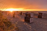 Strandgras en strandstoelen op het strand in de Oostzeebadplaats Kühlungsborn aan de Oostzee bij zonsondergang, Oostzeekust, Mecklenburg-Vorpommern, Duitsland