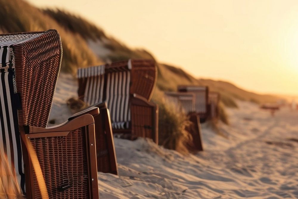 Een bijna fotorealistisch motief van strandstoelen op een strand dat doet denken aan Noord-Duitse strandlandschappen zoals Sylt.