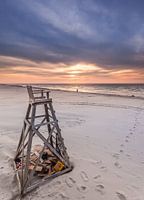Strandwacht stoel tijdens zonsondergang op het strand van Schiermonnikoog