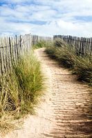 Wandeling door de duinen van de Franse kust in Bretagne. Dit strandpad is afgezet met houten latjes wat een heel fijn en zomers gevoel geeft. De kust is ruig met rotsen en kliffen. De wolkenlucht geeft veel detail aan de blauwe lucht.