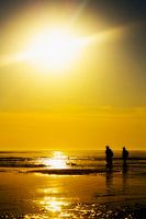 Strandwandeling: twee wandelaars aan de Nederlandse kustlijn. Het is zomer, de zon schijnt, er komt een puist zomerlicht omlaag en de wandelaars zijn silhouetten in het licht van de ondergaande zon.