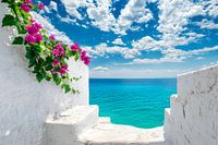 Een adembenemend uitzicht over azuurblauw water en glanzend witte muren, versierd met heldere bougainvillebloemen. Dit dromerige tafereel roept vakantiegevoelens op en zou een perfecte blikvanger zijn in de woonkamer of hal, en een vleugje mediterrane lichtheid toevoegen aan elke kamer. Ideaal voor ontspannen gesprekken en dagdromen!