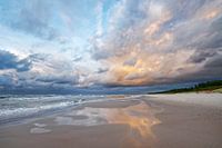 Breed uitzicht over een strandgedeelte, op de voorgrond zandribben en een wateroppervlak, daarboven gekleurde wolken die in het ondiepe water worden gereflecteerd - Ligging: Poolse Oostzeekust, Slowinski Park Narodowy (Slowinz Nationaal Park)