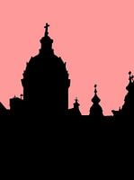 Zwarte contouren van de Sint Nicolaas basiliek in Amsterdam geaccentueerd door een pink roze lucht die goed past bij het homovriendelijke karakter van de stad.