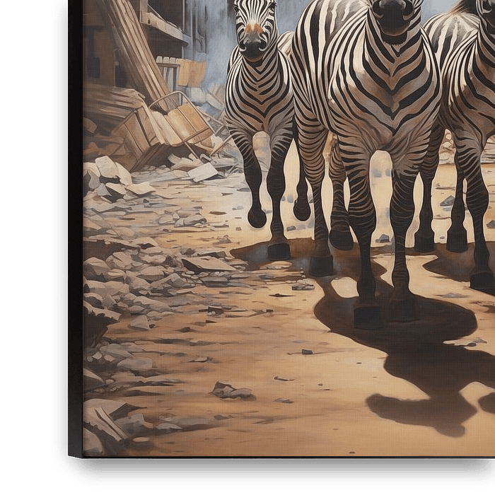 "Straten van Contrast: Zebra’s en Beton" is een indringend impressionistisch kunstwerk dat de natuurlijke schoonheid van zebra's op de voorgrond plaatst tegen de achtergrond van een stedelijke verwoesting. De drie zebra's, synchroon in stap, brengen een onverwachte wildheid naar de ruïnes van de menselijke beschaving, waarbij hun…