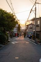 Straten van Kyoto in Japan tijdens zonsondergang na een zonnige lente dag. Gele lucht met enkele wolken en mensen die door de straten wandelen.