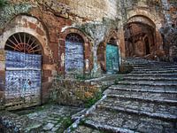 Kleurrijke vervallen straat met trap, bestraat met klinkers, ergens in het Toscaanse vestingstadje Pitigliano.