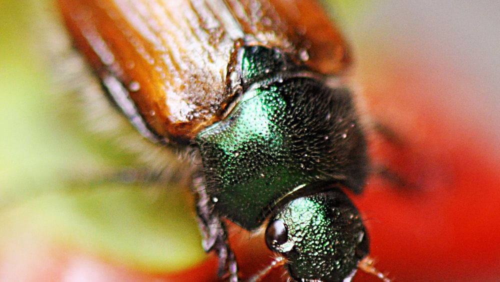 Deze kever geniet heerlijk van de restjes van een aardbei