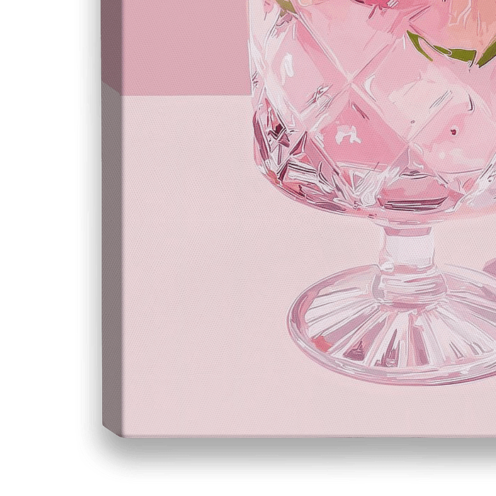 Een kristallen cocktailglas gevuld met een verfrissende roze drank, versierd met verse aardbeien en een schijfje limoen. Het glas staat tegen een zachte roze achtergrond die perfect harmonieert met de drankkleur. De ijsblokjes en het geslepen kristal creëren een spel van licht en reflecties, wat het geheel een luxueuze en zomerse uitstraling geeft.
