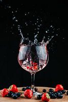 Splash foto van een aardbei die in een cocktail/gin drankje valt