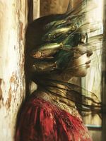 Surrealistisch visueel en emotioneel prikkelend tafereel waarin droom en werkelijkheid samenkomen. Het portret toont een vrouw in profiel, gehuld in een rode jurk met verfijnde kanten details. Haar gezicht is deels bedekt door een sluier van transparante stof waarin gouden vissen lijken te zwemmen, alsof haar gedachten of dromen een…