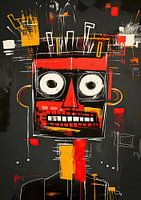 Een schilderij van de voorkant in de stijl van graffiti & street art, een cartoonrobot met grote ogen en een rode mond, een donkere achtergrond, minimalistische lijnen en abstracte vormen.