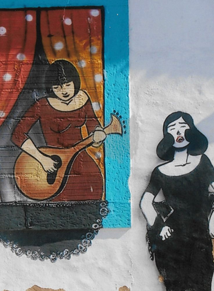 Het stelt een Fado zangeres voor die wordt begeleid door een vrouw die gitaar speelt .