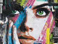 Portret, collage, pop-art, street art, mixed media, groene ogen, stedelijk, kleurrijk, hedendaags, vrouw, chaotisch, emotie, rebels, graffiti, modern