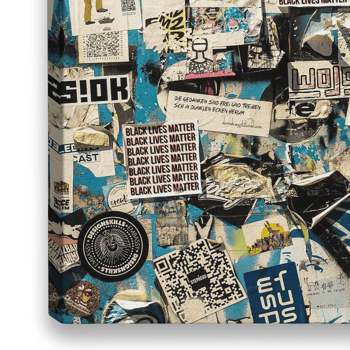 Op straat kom je vanalles tegen, zo ook dit beeld. Allerlei stickers geplakt over elkaar over diverse thema's. "Black Lives Matter" springt er echt wel uit omdat dit qua tekst prominent aanwezig is. De blauwe achtergrond komt er op diverse plaatsen nog mooi doorheen. Mooi als wand decoratie in een urban achtige omgeving, of…