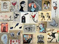 Een verzameling foto's van Street-Art in de straten van Florence in Italië. Kleine onopvallende kunstwerkjes, die zijn aangebracht op de muren van de oude stad. Zo klein dat de meeste mensen er gewoon aan voorbij lopen. Maar als je er eenmaal een gezien hebt, zie je deze vorm van kunst ineens overal. Tijdens onze wandeling door de stad ontdekken wij steeds meer van deze Street-Art. Heel bijzonder, sommige vertellen een verhaal, andere zijn gewoon grappig, kleurrijk of intrigerend. De stad Florence is prachtig, maar het ontdekken van deze kunstwerkjes maakte de stad voor ons nog meer bijzonder. Het is kunst die niet permanent is, vele afbeeldingen waren al aan het vervagen, en vele kunstwerkjes van papier kwamen los van de muur of waren gescheurd. Als eerbetoon en om deze vorm van kunst te bewaren heb ik deze collage gemaakt. Een intrigerend en interessant beeld voor aan de wand, waar je naar zult blijven kijken en steeds nieuwe dingen in zult ontdekken.