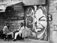 Slenterend door de wijk Karakoy in Istanbul kwam ik dit straatbeeld tegen: 3 mannen aan een tafel, drinkend en pratend. Op de achtergrond street art van een kunstenaar op een rolluik. De street art laat het beeld zien van een vrouwelijke fotograaf.
