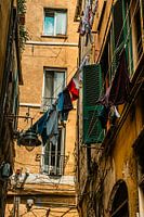 Smal steegje in Genua waar kleding aan was lijnen hangt te drogen en elektrischetijds draden kris kras door elkaar hangen. Oude vervallen muren in gele oker kleuren.