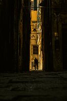 Doorkijkje in een van de smalle steegjes van Genua. Met prachtig invallend zonlicht aan het eind van het steegje met silhouette van een lopende man.