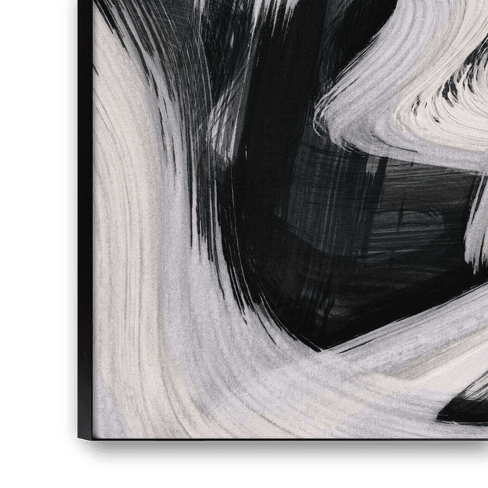 Monochroom abstract in zwart-, crème- en wittinten. Vette, natte penseelstreken wervelen over de compositie en creëren een gevoel van beweging en energie.