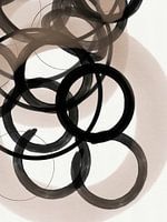 Zwarte cirkels, sommige gesloten, sommige open, op een achtergrond van grote lichtbruin gekleurde cirkels. Grafische kunst geschikt voor moderne, minimalistische en scandinavische interieurs.