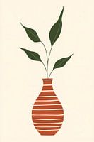 Een stijlvolle minimalistische illustratie waarin een gestreepte terracotta vaas centraal staat, versierd met vier elegante groene bladeren. De compositie straalt rust en harmonie uit door het gebruik van warme aardetinten en de eenvoudige maar effectieve lijnvoering. Het moderne ontwerp past perfect in de hedendaagse trend van…