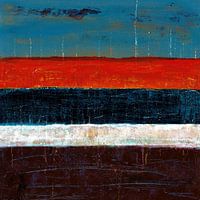 Laag voor laag aangebrachte acrylverf vormt brede horizontale strepen in aubergineviolet, wit, marineblauw, fel rood-oranje en middenblauw, waarbij diepere lagen als een palimpsest doorschemeren of weer tevoorschijn komen en textuur geven aan het abstracte werk. De afwisseling tussen warme en koele, lichte en donkere kleuren creëert contrasten.