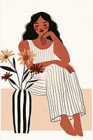 Illustratie van een vrouw met gesloten ogen in een gestreepte broek en hemd. De strepen zijn ook terug te vinden in de vaas met bloemen. De vaas is zwartwit, de broek en het hemd zwart beige. In de vaas staan gele en bordeauxrode bloemen. De achtergrond is wit met een zandkleurig vlak waarom zij lijkt te zitten. Hand onder haar kin en een hand op schoot. Rode wangetjes. Vector. Minimalistisch. Moderne kunst.