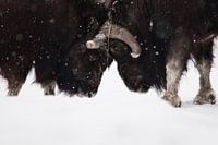 Slag (butting) mannen close-up. muskus ossen onder de sneeuwval in de winter, krachtig noordelijk beest van de ijstijd.