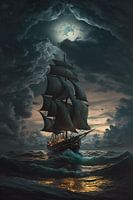 Het artistieke beeld toont een groot schip dat wordt geteisterd door hoge golven en sterke wind in een storm. De zee is wild en kolkend, en de donkere wolken in de lucht brengen een dreigende stemming over. Het schip vecht tegen de elementen en je voelt letterlijk de spanning en de chaos aan boord. De kunstenaar heeft het schilderij…