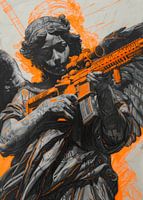 Een klassieke engel met een modern wapen in handen zorgt voor een onverwachte kruising van tijdperken en thema's. Geschikt voor een omgeving die waarde hecht aan kunst die verrast en uitdaagt.