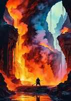 Een eenzame krijger staat op de drempel van een vurige grot, omringd door gesmolten rivieren en oude, afbrokkelende ruïnes. Torenhoge pilaren omlijsten het inferno terwijl rook en vlammen de lucht in schieten en een angstaanjagende gloed verspreiden. Met het zwaard in de hand staat de figuur oog in oog met het brandende hart van de berg, waar gevaar en lot in de schaduw van vergeten kracht ontvlammen.