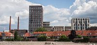 Uitzicht op Strijp-S vanuit de wijk buiten Strijp-S. In dit beeld zijn enkele appartementencomplexen op Strijp-S te zien, evenals de schoorstenen van de voormalige energiecentrale.