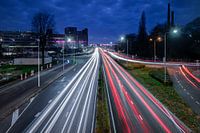 Strijps Bultje gefotografeerd tijdens het blauwe uur. Door gebruik te maken van lange sluitertijd technieken worden de voor en achterlichten van de auto's zichtbaar als 'lichtlijnen' terwijl het verkeer zelf niet zichtbaar is.