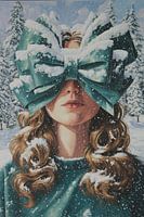 Strik Vrouw | Gift Eyes - Dit schilderij opent als een grapje en een kleine verrassing tegelijk: een gigantische kerststrik die als blinddoek over een gezicht is gelegd. De strik neemt het meeste van het beeldvlak in beslag — groot, soepel en bedekt met verse sneeuw — en doet denken aan een cadeau dat te nieuwsgierig is om meteen open…