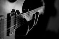 Een hand op de snaren van een elektrische gitaar.