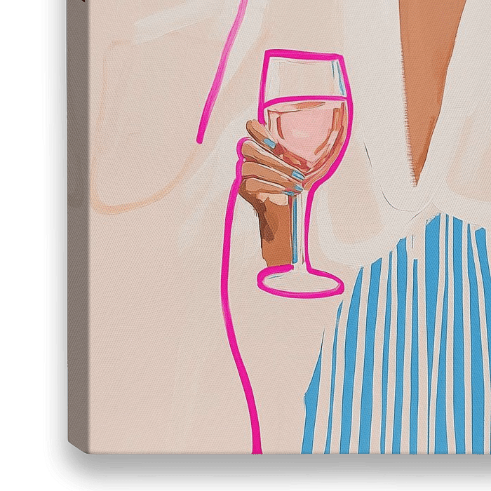 Dit kunstwerk straalt moeiteloze elegantie en moderne luxe uit. De minimalistische lijnen, gecombineerd met zachte kleuren, zetten een beeld neer van een stijlvolle vrouw in totale ontspanning. Haar nonchalante houding, met een glas rosé in de hand en haar casual-chique outfit met opvallende strepen, belichaamt een gevoel van zorgeloze…
