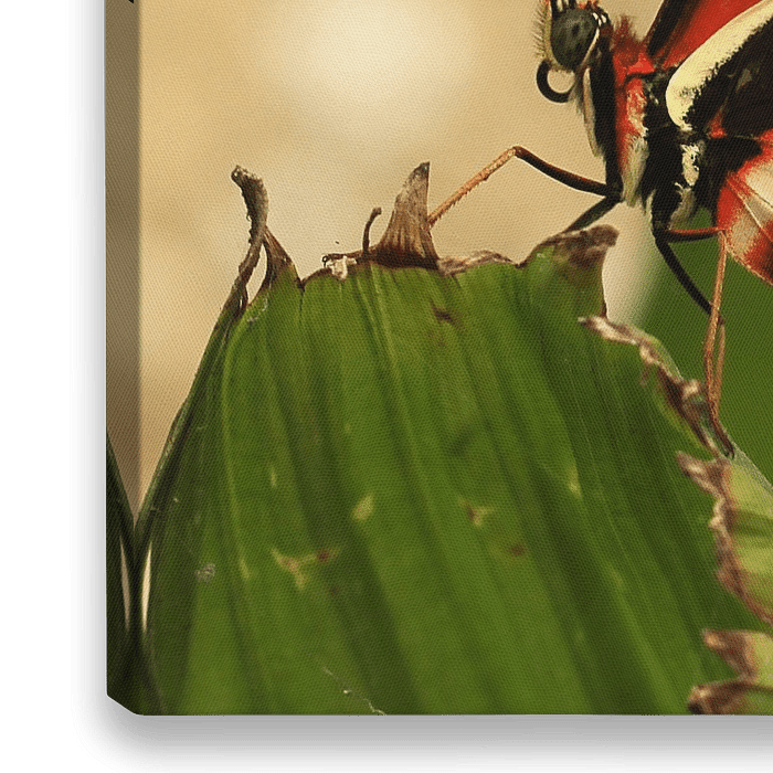 Foto van een zwart/creme gestreepte vlinder op een groen blad. Deze foto is ideaal voor een tuinposter /tuinposters.