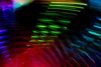 Blauwe, groene en paarse strepen licht in de ruimte gecombineerd met een draaikolk van rood licht. Turquoise, blauw, groen, rode, lichtblauw, lichtgroen, paars, roze, zwart.