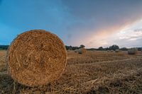 Na wat regen ligt deze baal stro op het veld en wordt door de avondzon gedroogd.