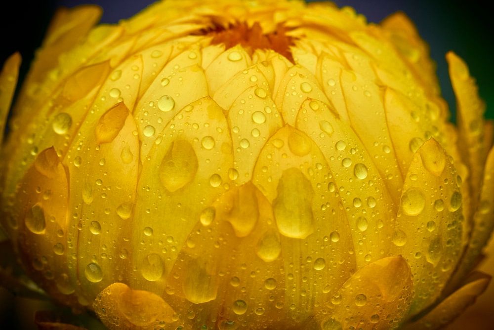 Strobloem in de knop net na een felle regenbui waarbij de strobloemen als vanzelf helemaal dichtgaan om de zaadjes te beschermen tegen de regen en het te vroege uitwaaien of met insecten mee te liften.