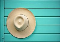 Strohoed op turquoise houten paneel. De hoed is lichtbeige en domineert de linkerkant van het frame.