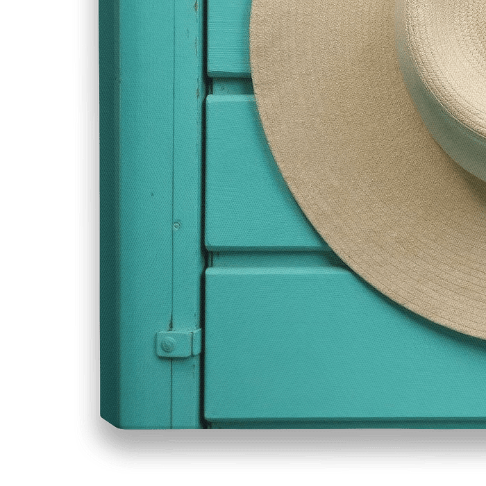 Strohoed op turquoise houten paneel. De hoed is lichtbeige en domineert de linkerkant van het frame.