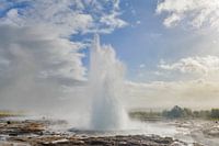 Uitbarsting van de Strokkur Geiser in het Haukadalur geothermisch gebied in IJsland op een zomerse dag. Strokkur Geyser is een van de beroemdste geisers in IJsland en staat bekend om zijn frequente uitbarstingen die kokend water hoog de lucht in schieten. De uitbarsting van Strokkur volgt meestal een specifiek patroon, waarbij het water in de krater borrelt en opstijgt tot het uiteindelijk in de lucht explodeert en een pluim van stoom en water tot 30 meter hoog stuurt. Tijdens een uitbarsting kun je een rommelend geluid horen als het water onder het oppervlak druk opbouwt. Dit wordt gevolgd door een plotselinge uitstoot van stoom en water, waardoor een dramatisch en visueel verbluffend schouwspel ontstaat.
