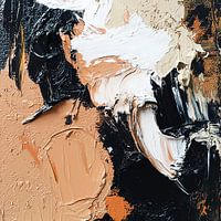 Een abstract schilderij met dikke, impasto penseelstreken. De kleuren zijn overwegend aardse tinten gecontrasteerd met zwart en helder wit. De textuur is zeer zichtbaar, met verf aangebracht in sculpturale vormen die een gevoel van beweging en diepte creëren. De compositie is dynamisch met wervelende lijnen en organische vormen.
