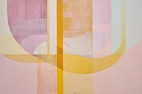 Dit minimalistische, abstracte kunstwerk speelt met zachte lijnen en gebogen vormen die beweging en dynamiek oproepen. In de voorgrond verschijnen twee grote, ronde vormen, terwijl subtiele verticale stroken in roze, geel en oranje het werk diepte en contrast geven. Het luchtige kleurenschema in pasteltinten creëert een gevoel van balans en openheid, waardoor het schilderij zowel krachtig als verstild aanvoelt.