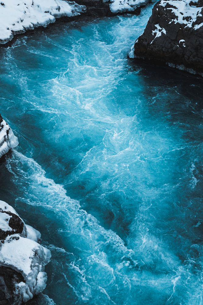 Deze rivier in IJsland werd gevoeg door de achterliggende waterval. Door de toevoeging van het sneeuw heeft deze foto een uniek contrast. Ijzig blauw water, zwarte rotsen en wit sneeuw.