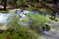 Een bergriviertje stroomt idyllisch onder de bomen door.